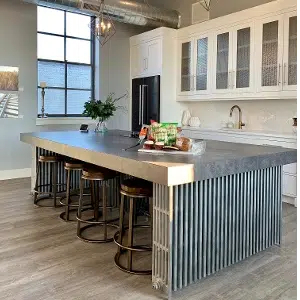 Greenwich, CT interior design firm, Amazing Spaces, has done just that. This transitional kitchen with an industrial edge features stunning quartz countertops that flawlessly blends neutral tones. To help anchor the room, the designer chose thick quartz countertops. This also helps give the space a modern edge. The quartz stone showcases a myriad of neutral colors and displays thick veining in a darker beige to create visual interest.