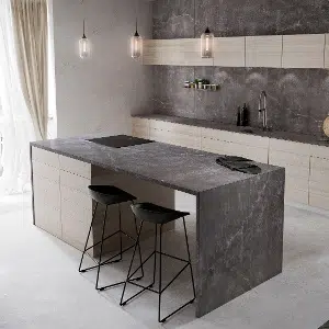 Caesarstone’s Rugged Concrete and Cloudburst Concrete are great examples of quartz alternatives to concrete kitchen countertops. These countertops come in your choice of polished, honed, concrete, and rough surfaces.